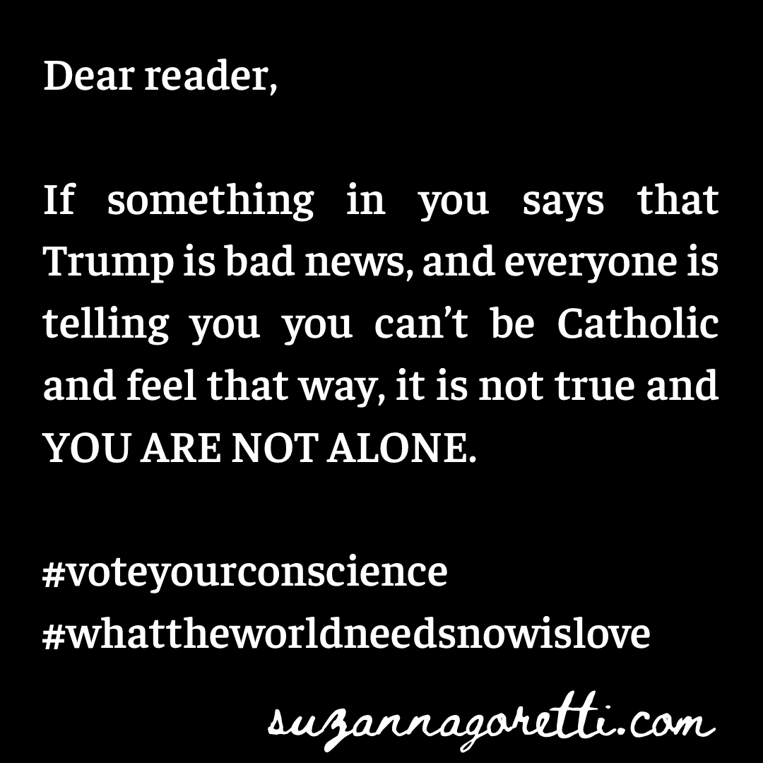 I have never been more proud of a moment in my life than the one when I decided I could not vote for Trump. Every time I see what he is doing, I can say, I did everything I could to keep this from happening. More importantly though, I remember how lonely I was in it, and how scared I was. This year, I want to make sure that no one feels that way. You do not have to agree with me. If your conscience says you must vote for Trump, then please do that, but if something in you says that what he is doing is not ok, then I want you to know that YOU ARE NOT ALONE.