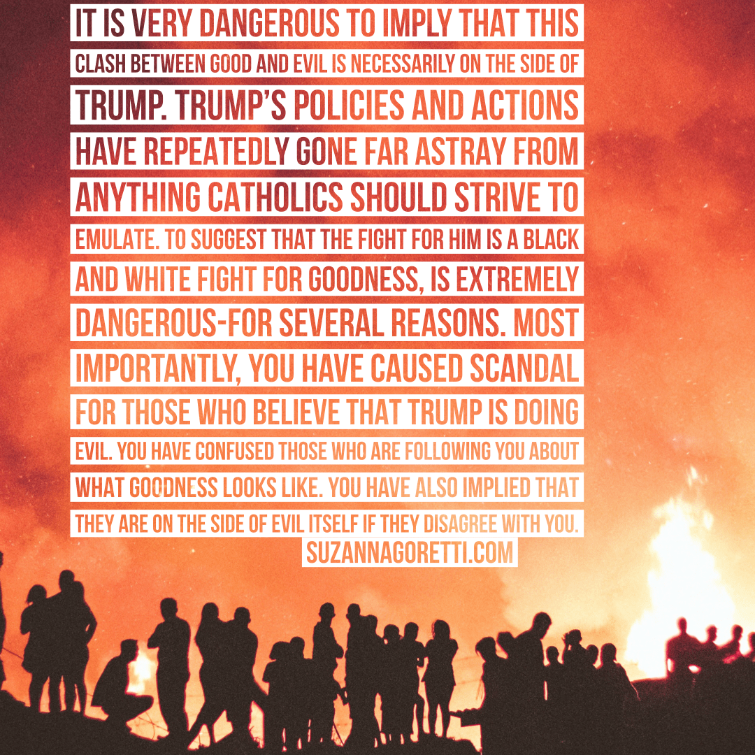 It is also very dangerous to imply that this clash between good and evil is necessarily on the side of Trump. Trump’s policies and actions have repeatedly gone far astray from anything Catholics should strive to emulate. To suggest that the fight for him is a black and white(in the letter I said black and white, but a wonderful visitor pointed out that that could lead to racist connotations, which was completely unintentional, so I would change my wording for next time–maybe to a one-sided) fight for goodness, is extremely dangerous-for several reasons. Most importantly, you have caused scandal for those who believe that Trump is doing evil. You have confused those who are following you about what goodness looks like. You have also implied that they are on the side of evil itself if they disagree with you.