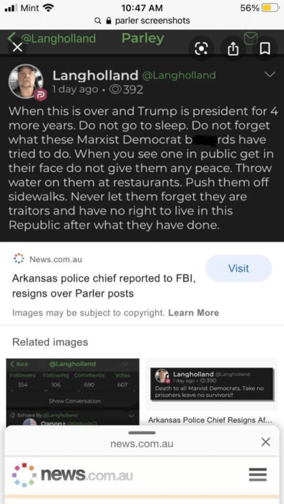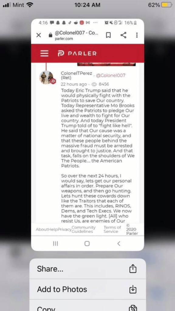 When someone close to me asked me to prove that Parler is dangerous and that the shut down is not an enormous act against the first amendment, my first impulse was to comment back something snarky, like “If you don’t see how this is not the issue, I can’t help you,” or “You will just ignore all my sources anyway,” or “I don’t really feel like being cyber tarred and feathered today.” What I really meant by those things I said in my head was, “I’m scared. My anxiety gets worse every time I read the screenshots from Parler. I don’t want to look for more.” Many of my friends are at a point of writing off all republicans, but I believe that there is good in many of them, and that there is hope for unity between all of us.(Let me clear that this has a big side note that for lawmakers and participants in Wednesday’s events and even those who have made horrible comments to others, that they must be held accountable for their actions.) I waited until I felt like I could emotionally hand the search, and I sent her what I could find. Here are the results.